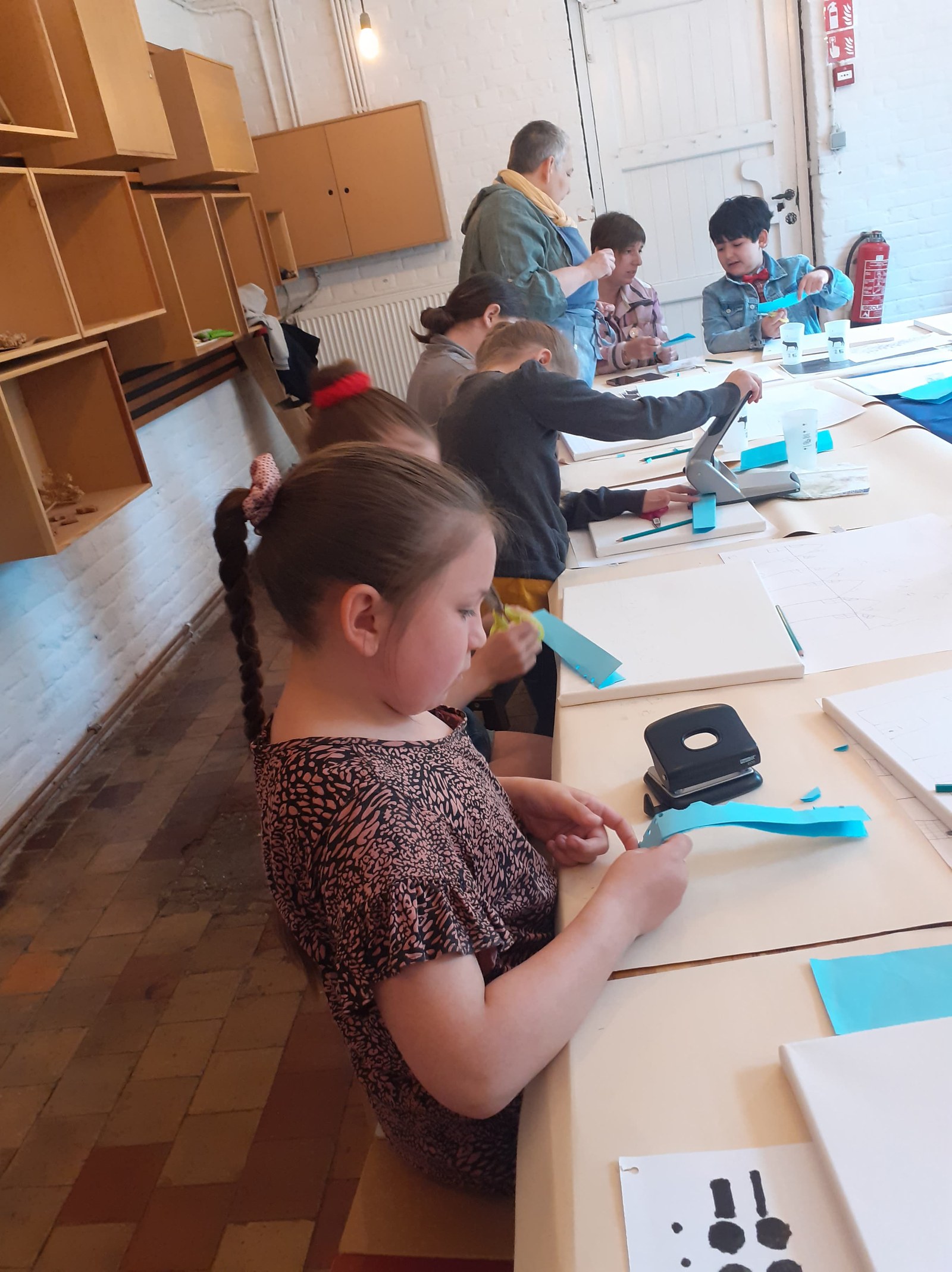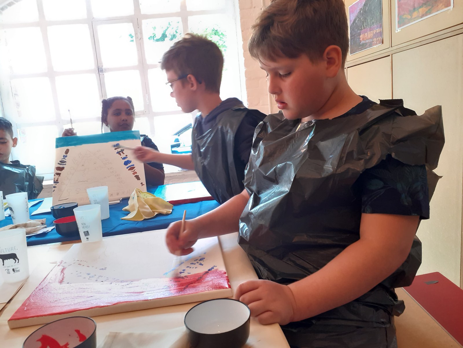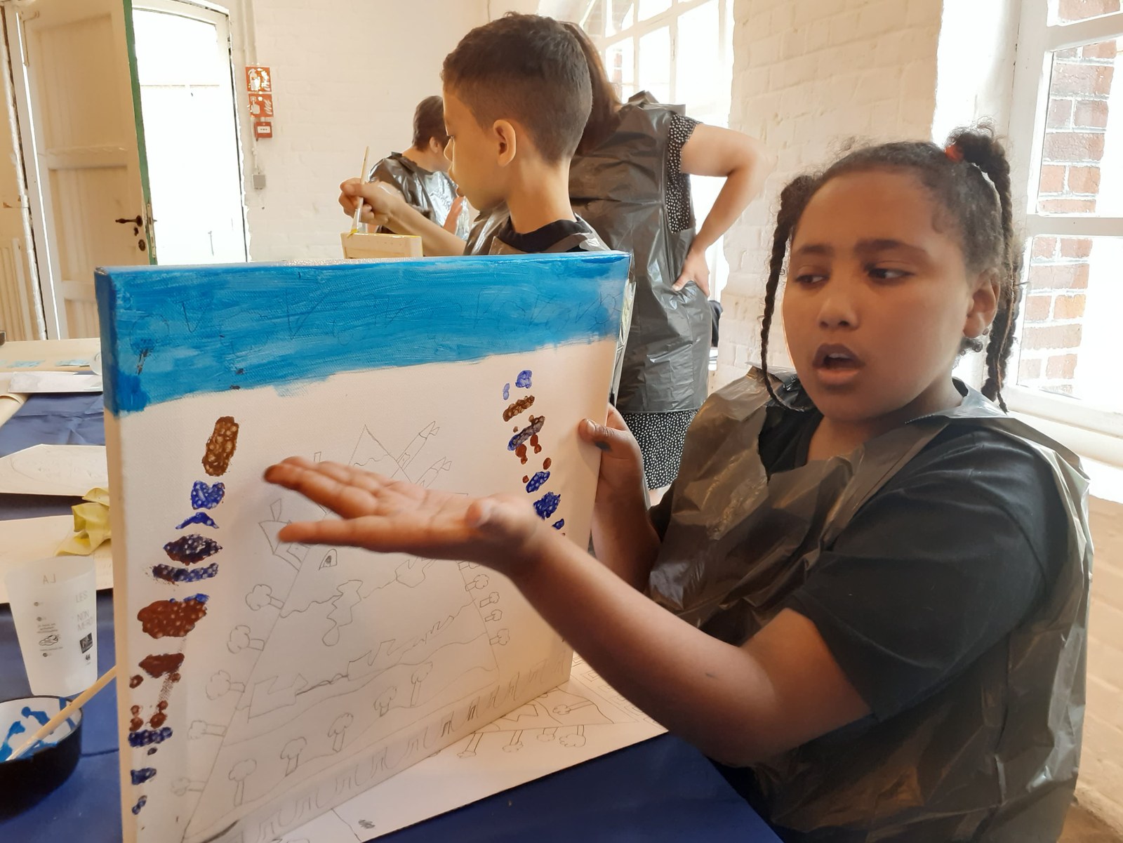 Installés dans le petit atelier pédagogique, les enfants sont étonnamment calmes et patients. L’environnement de bois upcyclé et de cocon à leur taille y serait-il pour quelque chose ? Françoise, l’animatrice, explique étape par étape la façon dont on va procéder. C’est très lent et posé et cela semble leur convenir. D’abord, dessiner l’esquisse sur papier – il faut au moins un terril, peut-être des maisons et un site industriel. Ensuite, la reproduire sur sa toile, que l’on a choisie carrée ou rectangulaire, sans trop appuyer sur la mine de crayon. Pas si simple que cela et certains y réussissent mieux que d’autres. Place à la peinture proprement dite. Pour le fond, il s’agit d’ »imiter » les circuits imprimés qui sont la marque de fabrique de Daniel Pelletti : on plie en deux des papiers, on coupe au milieu et on déplie, comme quand on faisait des petits napperons de dentelle. On utilise la perforatrice pour parsemer son pochoir de trous. Ensuite, on emballe tout le monde dans des sacs poubelle pour préserver les vêtements des taches d’acrylique. Le pochoir bien placé sur la toile – droit, de travers, en bas, en haut : comme on le souhaite -, on applique la peinture avec des cotons tige, certains la sèchent en tamponnant avec une éponge.