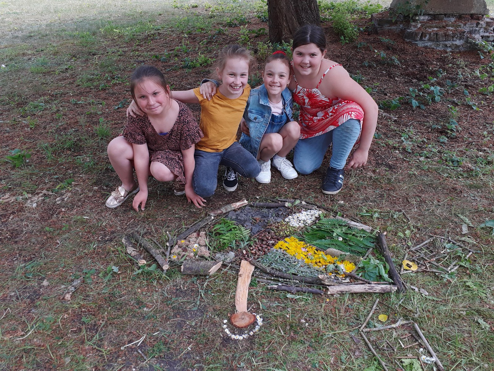 Après-midi, Françoise explique ce qu’est le land art : faire de l’art avec les éléments de la nature. Ici, bien sûr, on va essayer de représenter un terril ! Quelques règles pour collecter sans abîmer, et c’est parti ! En ce mois de mai, il y a vraiment beaucoup d’éléments intéressants : le jaune des boutons d’or et des pissenlits, le vert des cerises pas mûres (on a pu couper la branche parce qu’elle gênait), et de hautes herbes, le bleu des myosotis. Beaucoup de petit bois mort et le schiste rapporté du terril. On dirait que certains préfèrent la collecte que la création patiente de l’œuvre. Il faut travailler en équipe : le collectif est plus difficile que la création personnelle d’une œuvre. Les enfants se disputent un peu, il y a les meneurs, ceux qui ne se sentent pas écoutés, ceux qui rapportent beaucoup de choses mais ne prennent pas le temps de bien les disposer. Zakary ne prend que les chatons, Philippe va au-delà des limites données et revient les jambes remplies de piqûres d’orties. Et pourtant, ils continuent à tous retourner dans cette zone : l’appel du large !