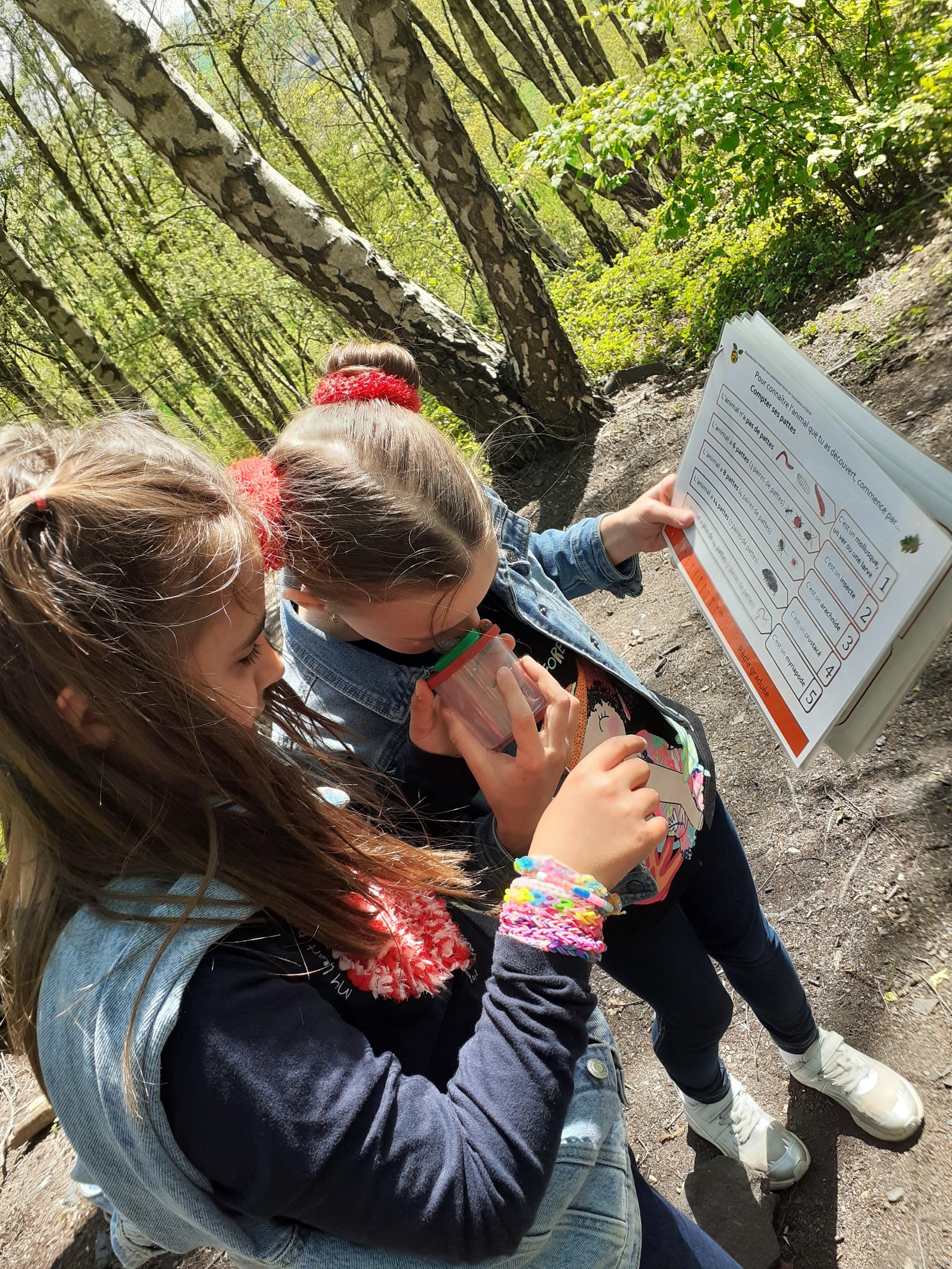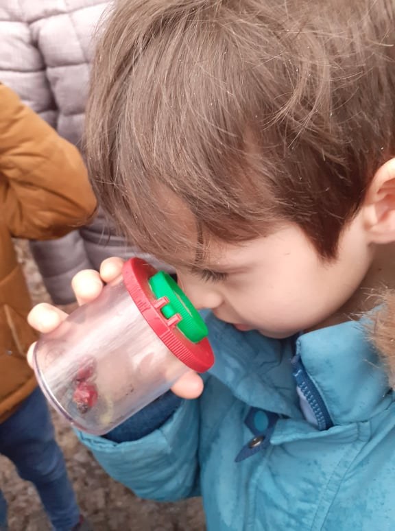 Le printemps est vraiment là ! La végétation est dense. « Avant, y avait pas d’arbre », dit Philippe. « Pas d’arbres ? Vraiment ? Précise un peu ce que tu veux dire… « Il n’y avait pas de feuilles sur les arbres, ils étaient tout nus ! ». On approche le terril par un autre côté que les deux premières fois, histoire de bien observer les changements de loin. Puis on se rapproche, et là, c’est toute une symphonie d’oiseaux qui nous accueillent : on s’en souvient, la première fois, en hiver, on avait à peine entendu deux oiseaux… Quelle joie d’être dans la nature, de pouvoir marcher ou courir à son rythme (enfin presque) ! On prend le chemin à la file indienne, on observe les schistes, le cerisier en fleurs -ce qui nous permet de nous rappeler la façon dont les graines se dispersent. Les oiseaux adorent les cerises !! Maëlyne passe la première et sursaute quand une tourterelle s’échappe d’un buisson à son arrivée : laquelle des deux a fait le plus peur à l’autre ? On se rend compte qu’on passe par le versant sud du terril : grâce au soleil et à la végétation. Puis on emprunte un chemin escarpé jusqu’au petit coin aménagé par l’école du dehors : aujourd’hui, c’est à nous de faire l’école dehors ! On s’assied en cercle sur les rondins de bois. Première mission : observer les petites bêtes au sol après les avoir attrapées délicatement et à l’aide de la clé de détermination. On soulève de vieilles souches ou des pierres : quel grouillement !! Beaucoup de cloportes, quelques chenilles qui avancent en se tortillant. Pas facile de compter le nombre de pattes tellement les animaux bougent ! Ensuite, on étale un grand papier blanc au sol et on secoue la branche juste au-dessus : quelques petites bêtes qu’abritait l’arbre y tombent… Philippe a peur des petites bêtes et participe peu à l’activité, même si Maelys essaie de l’entraîner.