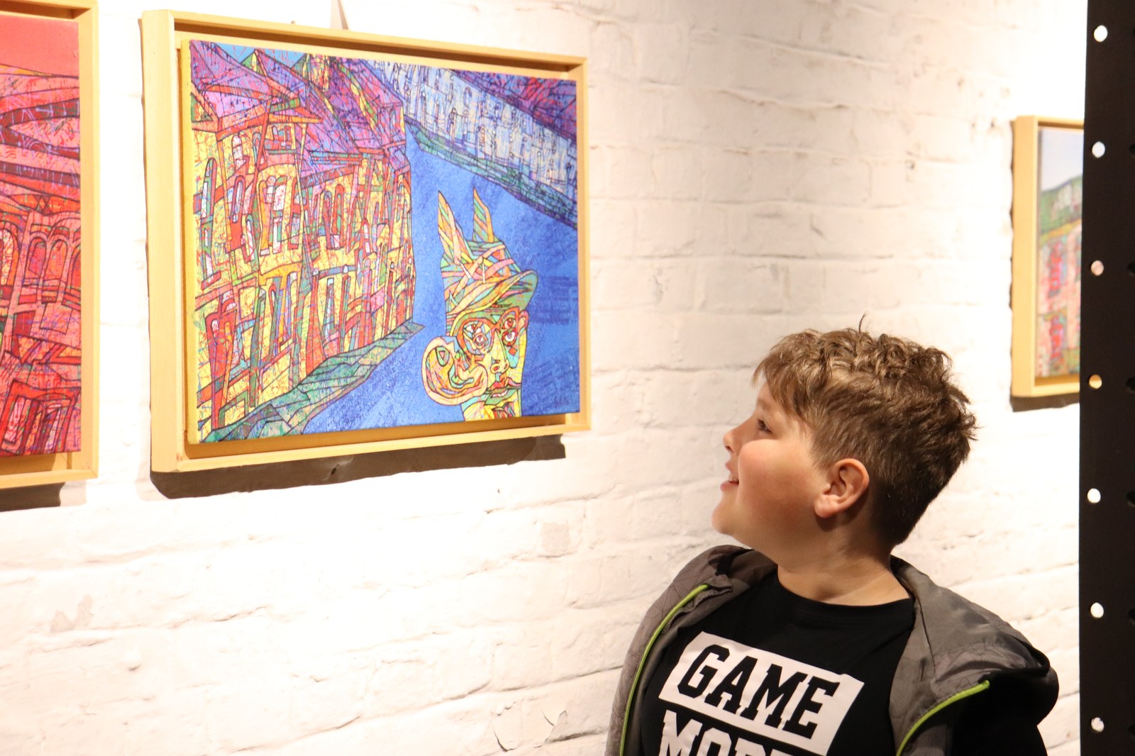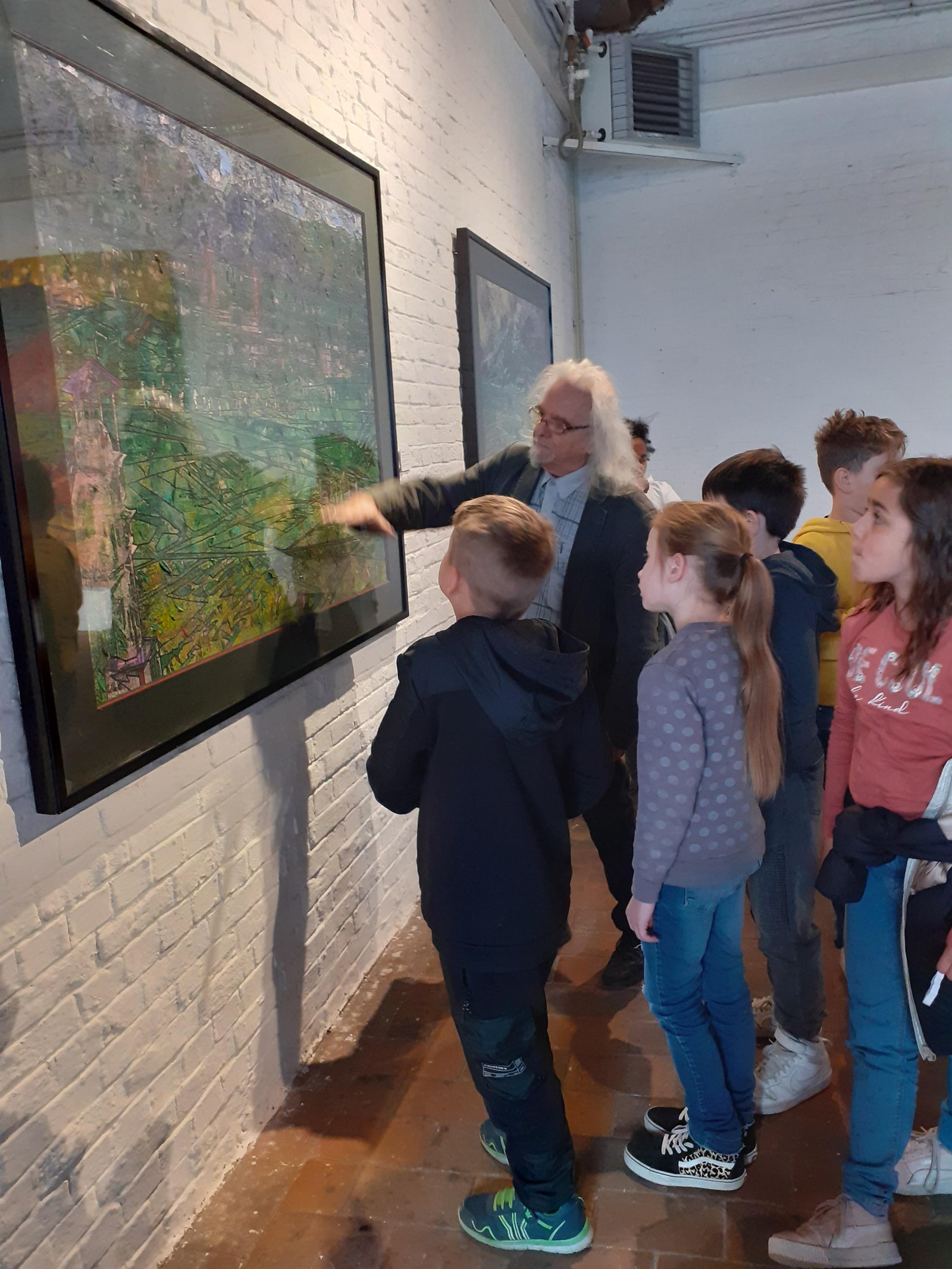 Le grand jour est arrivé : les enfants découvrent l’exposition de Daniel Pelletti. Un premier contact pour la plupart avec l’art ; la spontanéité est de mise en abordant les œuvres. Avant d’entrer quelques consignes s’imposent : sur le terril, on courait et on touchait tout ce qu’on voulait ; dans une exposition, on est calme, on se tient à distance des œuvres pour ne pas les abîmer. Deux univers complètement différents. Les enfants sont fiers : ils ont la chance de découvrir l’exposition en primeur, avant les journalistes et les autres visiteurs ! Ils ont également la chance de découvrir les coulisses du montage d’une exposition : les préparatifs ne sont pas encore tout à fait terminés.