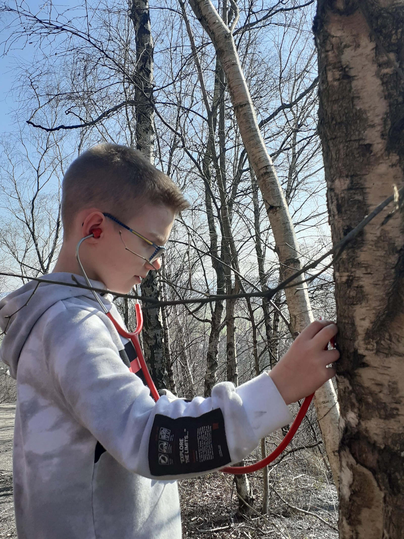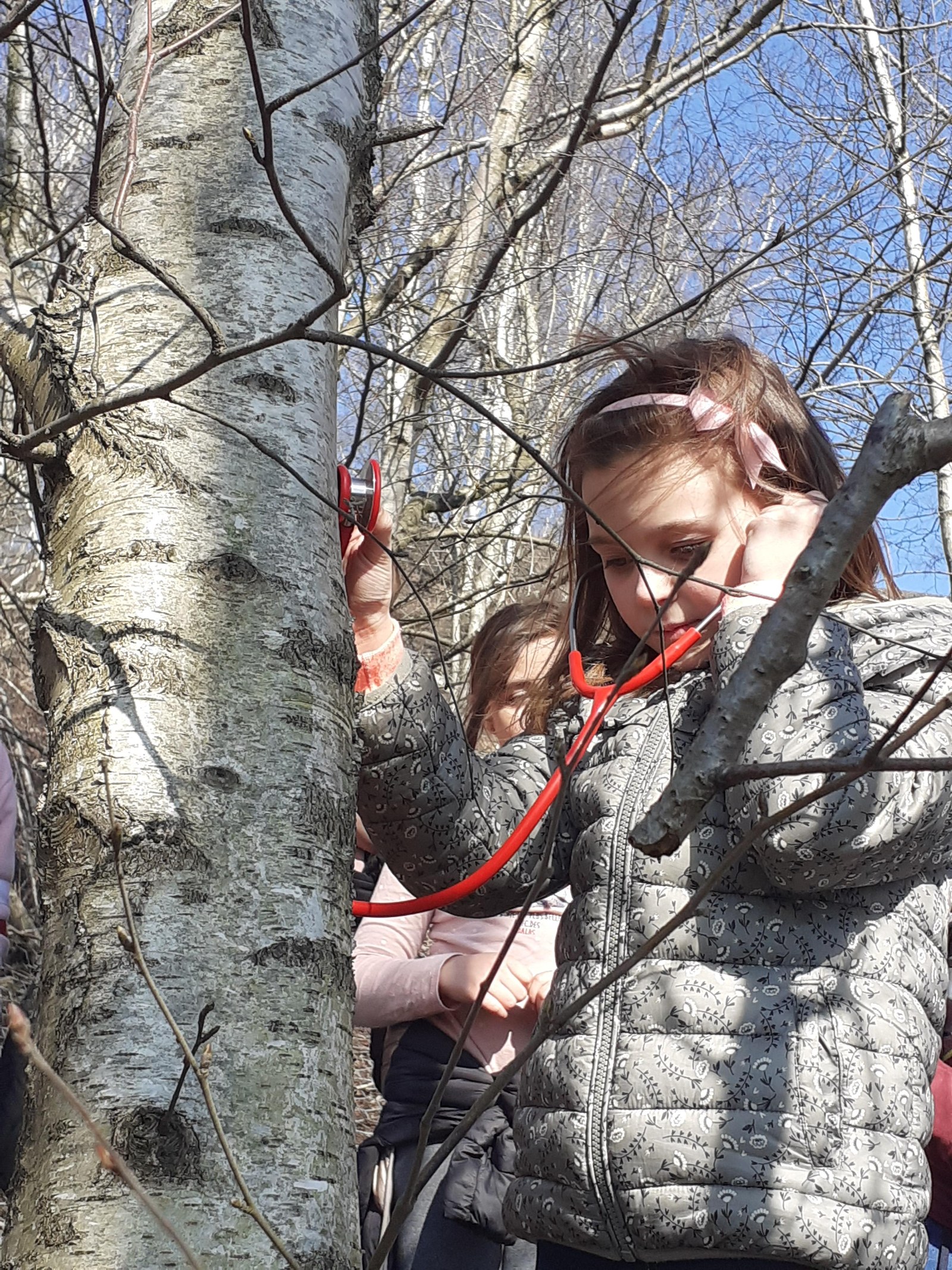 Surprise : on va jouer au docteur ! On va ausculter le tronc d’un bouleau avec un stéthoscope pour essayer d’entendre la sève couler. Mais ce n’est pas évident… Il y en a même un qui entend un aigle ; et le voilà parti au pays des Indiens.