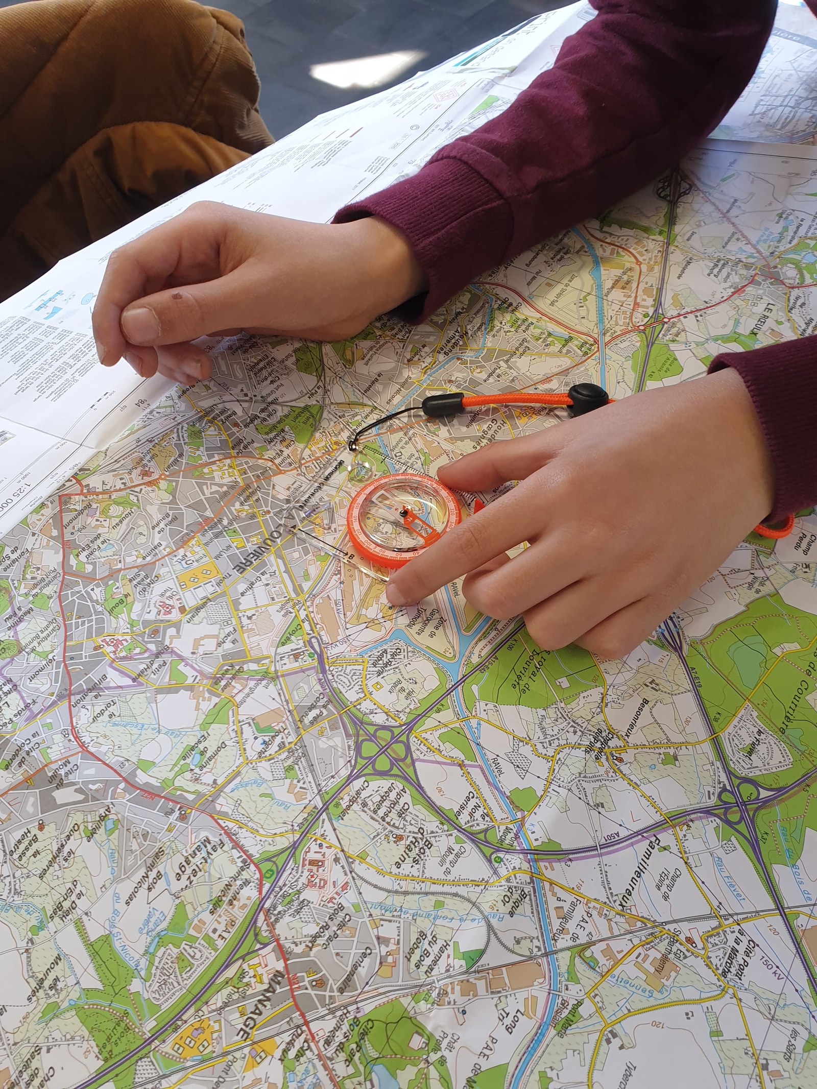 Ce matin, on a découvert en classe comment trouver son chemin :  à l’aide d’un gps quand on part en voiture avec les parents (eh non, un gps, ce n’est pas de la magie : quand il nous montre le chemin, c’est grâce aux satellites ! ). « Dans la voiture de ma tante, il n’y a pas de gps, alors on prend une carte ! » Chaque groupe reçoit un type de carte différent : carte routière, carte topographique, plan de ville ; chacune a son utilité. On repère l’école : le plus facile est de trouver un indice qui peut nous aider. L’église en face de l’école, ce sera parfait : il suffit de chercher une croix ! Puis on trouve les « carrés de Bois-du-Luc ». Le dessus de la carte étant toujours au Nord, on tourne les cartes jusqu’à trouver la bonne orientation, puis on vérifie avec les boussoles !