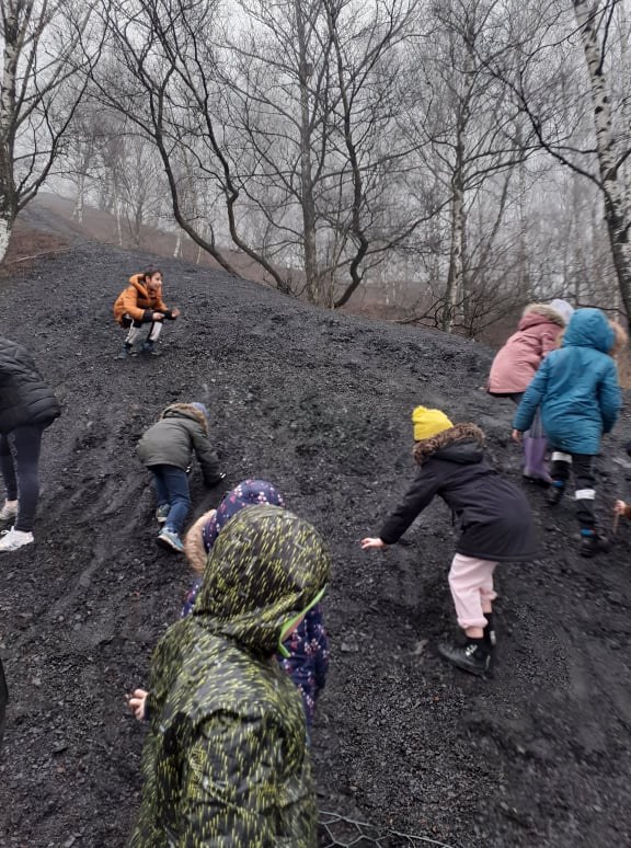 Il pleut. Il a fait beau en début de semaine, et voilà qu’aujourd’hui, parce qu’il faut monter sur le terril, il pleut à verse ! Heureusement, ça n’a pas trop l’air d’effrayer les enfants. Ils ont chaussé leurs vieilles baskets ou leurs bottes, enfilé des vêtements qu’ils peuvent salir, et c’est parti ! Brouhaha généralisé !