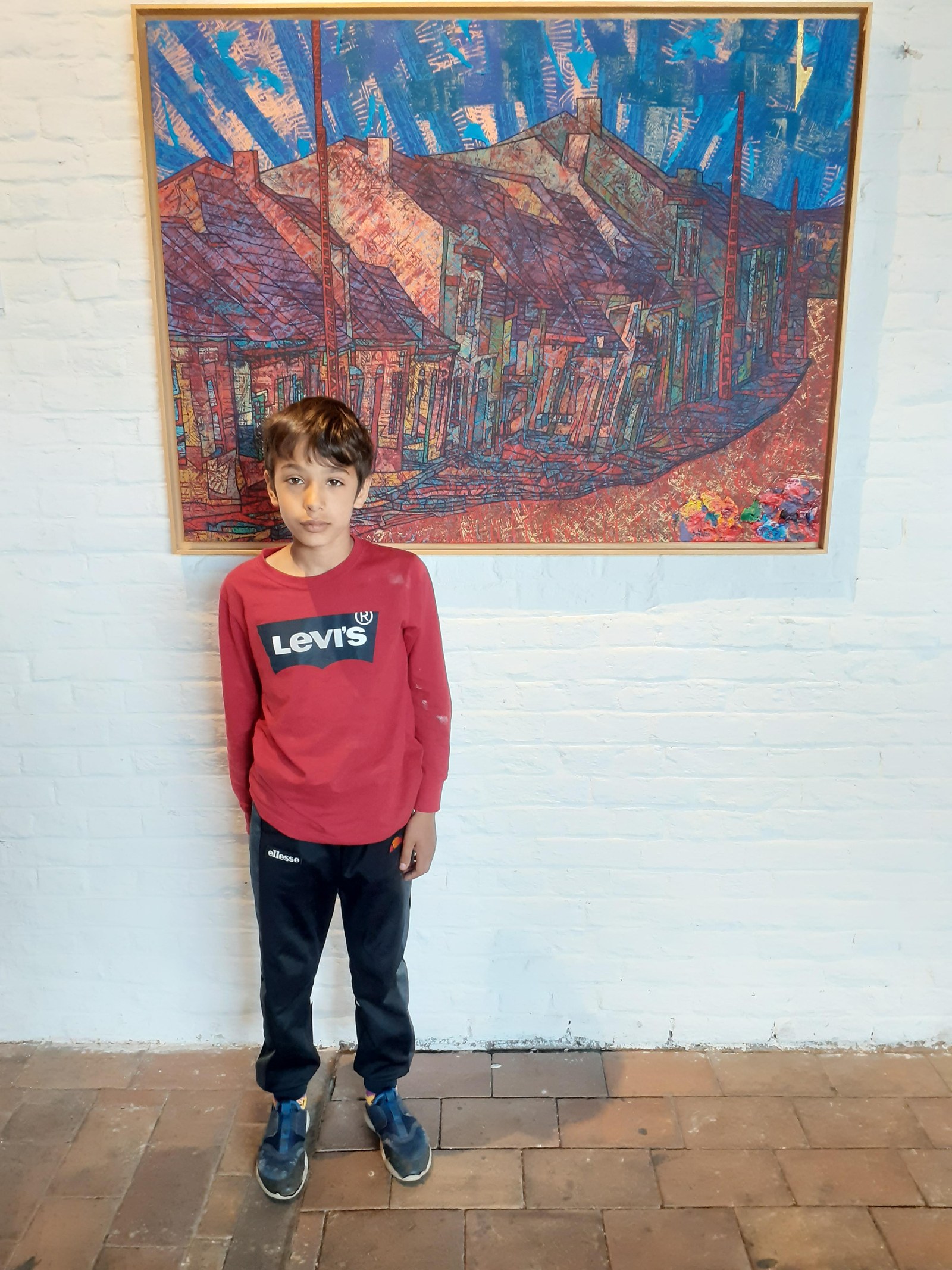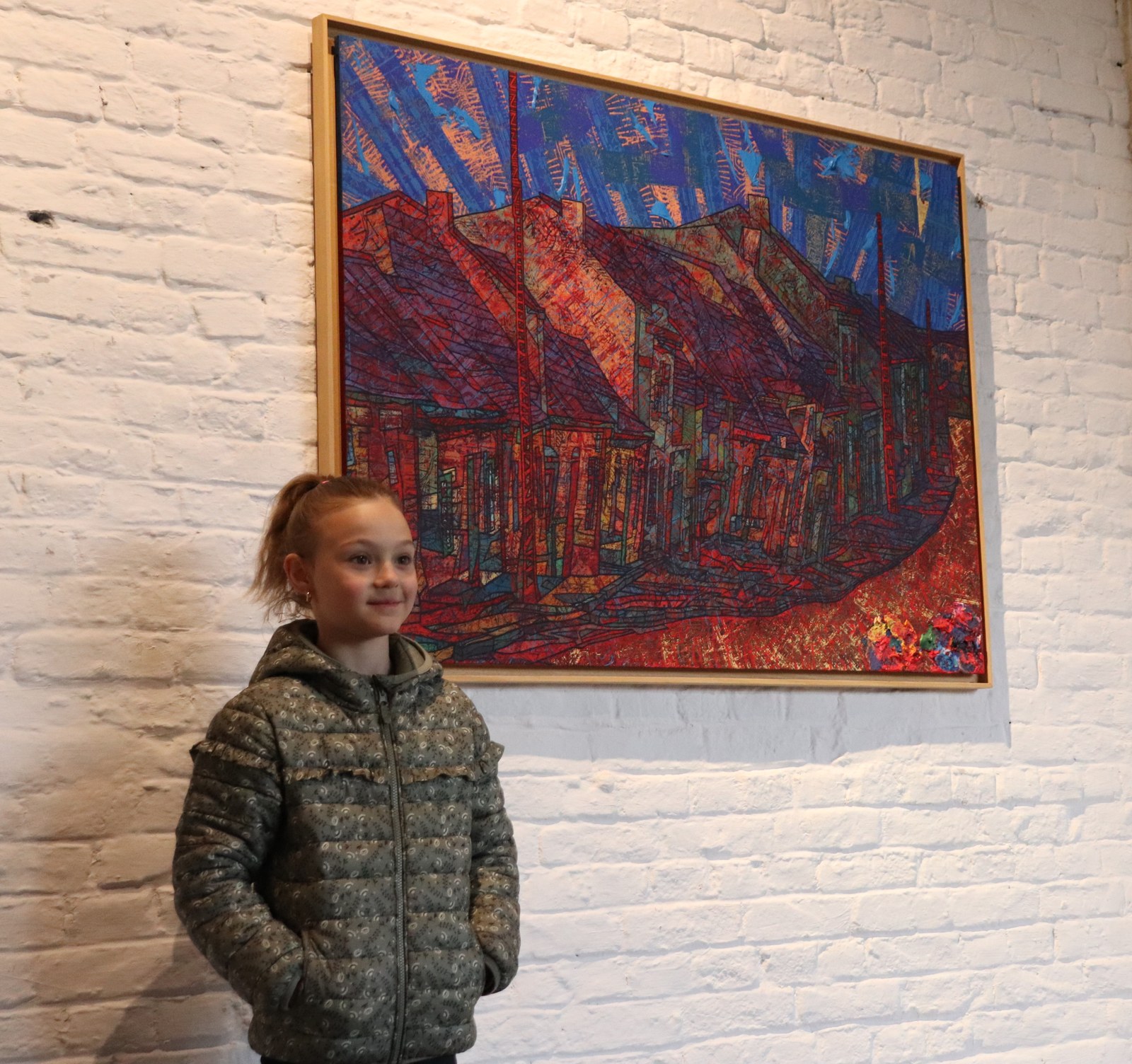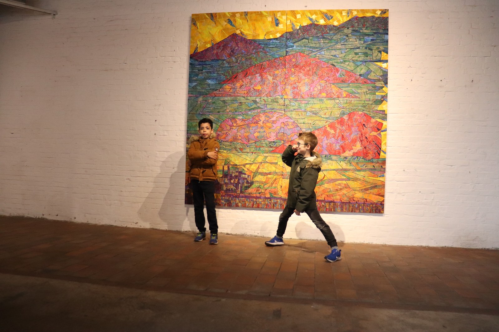 Avant d’entrer, les enfants me montrent les dessins qu’ils ont fait du terril. Certains se veulent fidèles, d’autres ont déjà mis leur petit grain d’imagination et de réappropriation. Alparslan par exemple y a parsemé plusieurs formes géométriques, Philippe a représenté un terril d’autrefois mêlé à un terril d’aujourd’hui. L’idéal pour expliquer que l’artiste nous donne à voir sa propre vision du monde et non la réalité telle qu’on pourrait la voir sur des photos. Dès l’entrée, ce sont des yeux émerveillés par toutes ces couleurs qui jaillissent au premier regard. J’explique que Daniel Pelletti est le voisin de leur école, qu’il a grandi dans ce paysage et qu’il le réinterprète à sa façon.