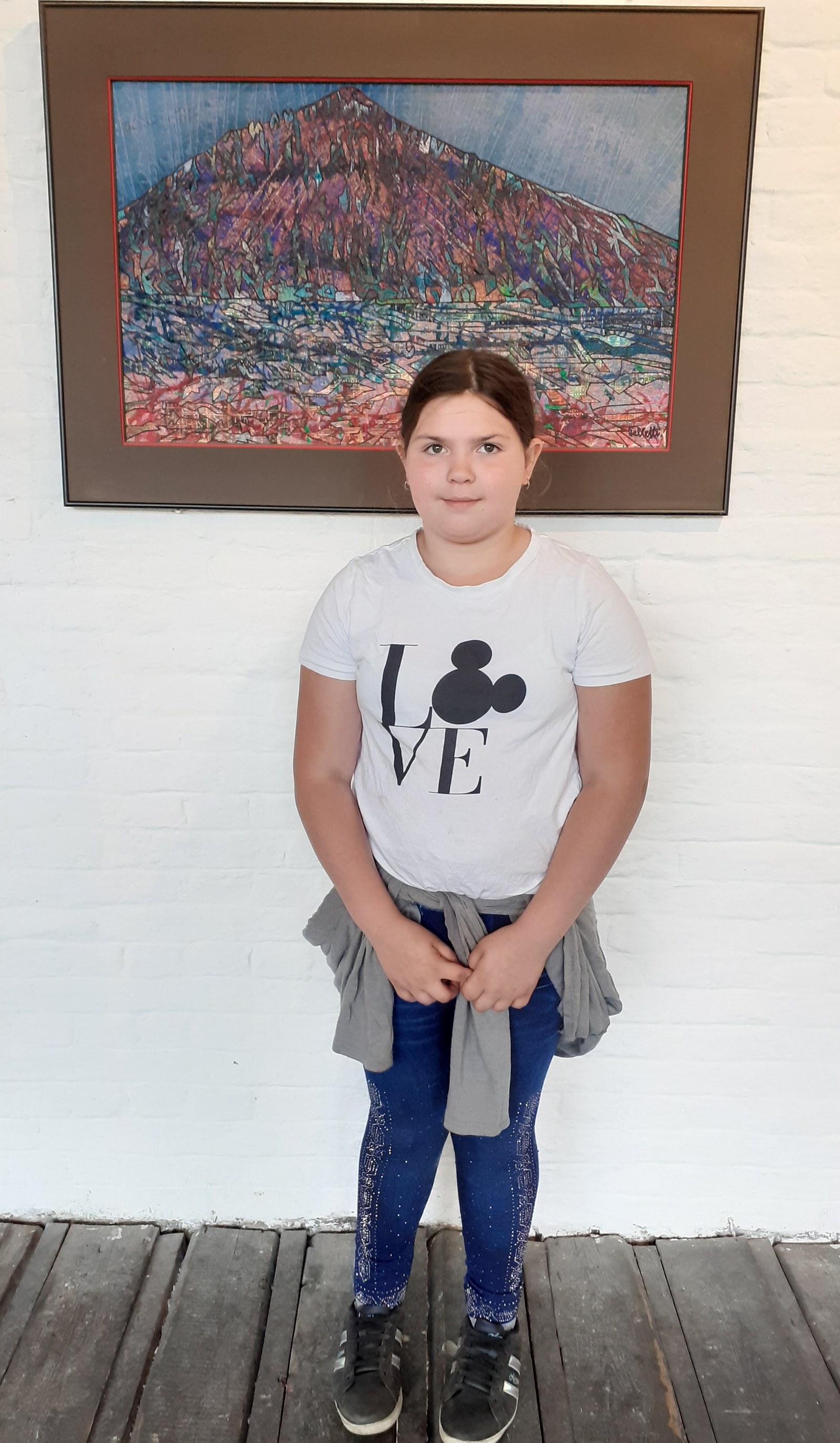 Maëlyne : « J’aime bien celui-ci parce qu’en bas, il a voulu montrer les couleurs qu’il a mises dans son tableau. Il y a des motifs qui font penser à de gros rochers, comme dans l’ancien temps ceux qui dessinaient dans les grottes »