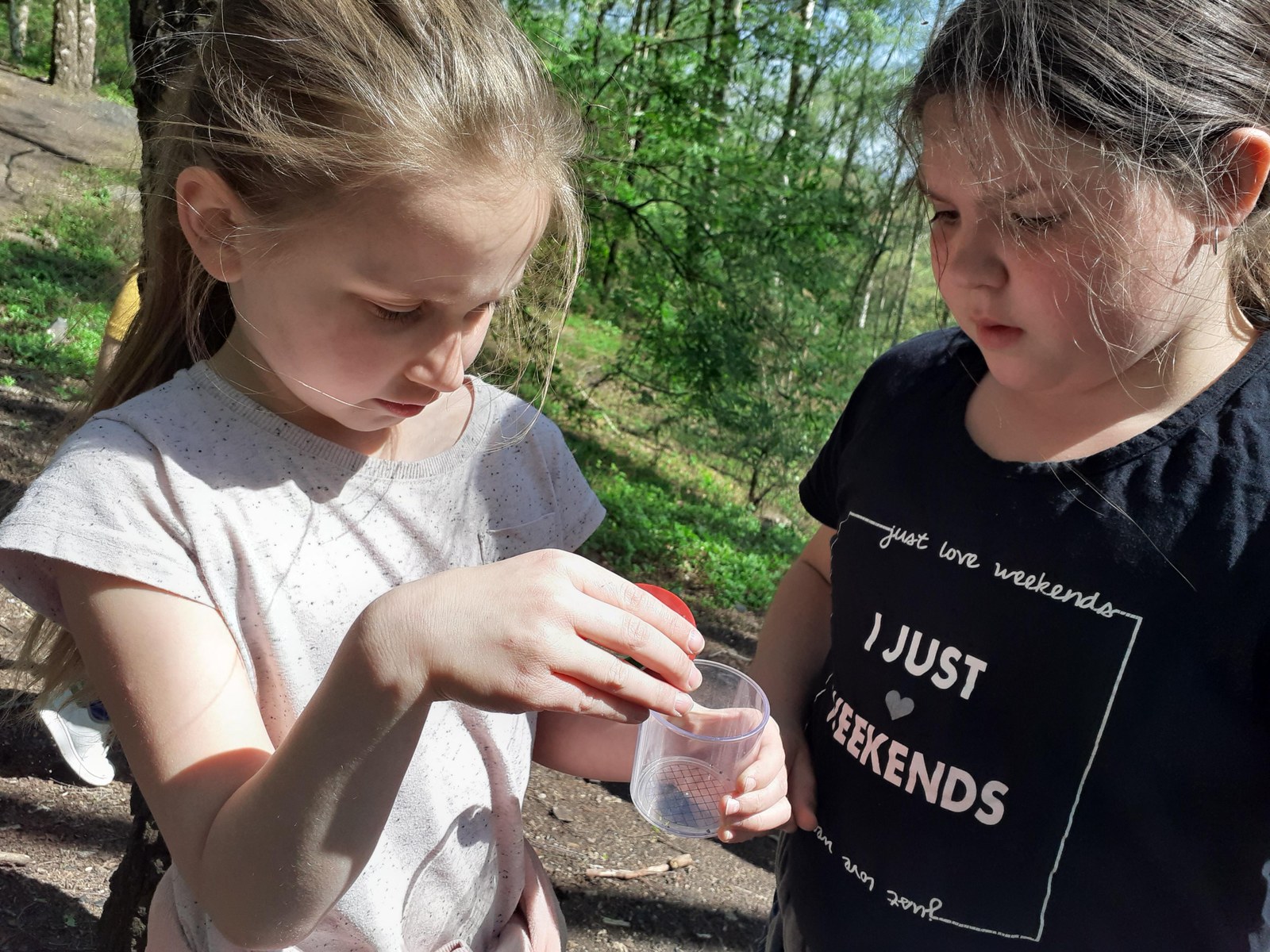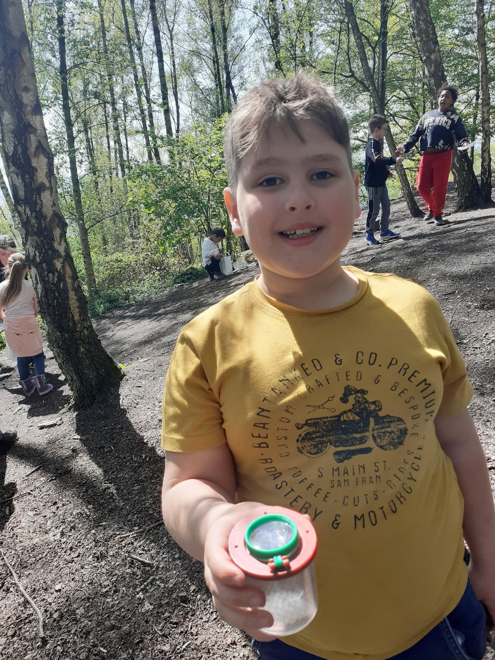 Le printemps est vraiment là ! La végétation est dense. « Avant, y avait pas d’arbre », dit Philippe. « Pas d’arbres ? Vraiment ? Précise un peu ce que tu veux dire… « Il n’y avait pas de feuilles sur les arbres, ils étaient tout nus ! ». On approche le terril par un autre côté que les deux premières fois, histoire de bien observer les changements de loin. Puis on se rapproche, et là, c’est toute une symphonie d’oiseaux qui nous accueillent : on s’en souvient, la première fois, en hiver, on avait à peine entendu deux oiseaux… Quelle joie d’être dans la nature, de pouvoir marcher ou courir à son rythme (enfin presque) ! On prend le chemin à la file indienne, on observe les schistes, le cerisier en fleurs -ce qui nous permet de nous rappeler la façon dont les graines se dispersent. Les oiseaux adorent les cerises !! Maëlyne passe la première et sursaute quand une tourterelle s’échappe d’un buisson à son arrivée : laquelle des deux a fait le plus peur à l’autre ? On se rend compte qu’on passe par le versant sud du terril : grâce au soleil et à la végétation. Puis on emprunte un chemin escarpé jusqu’au petit coin aménagé par l’école du dehors : aujourd’hui, c’est à nous de faire l’école dehors ! On s’assied en cercle sur les rondins de bois. Première mission : observer les petites bêtes au sol après les avoir attrapées délicatement et à l’aide de la clé de détermination. On soulève de vieilles souches ou des pierres : quel grouillement !! Beaucoup de cloportes, quelques chenilles qui avancent en se tortillant. Pas facile de compter le nombre de pattes tellement les animaux bougent ! Ensuite, on étale un grand papier blanc au sol et on secoue la branche juste au-dessus : quelques petites bêtes qu’abritait l’arbre y tombent… Philippe a peur des petites bêtes et participe peu à l’activité, même si Maelys essaie de l’entraîner.