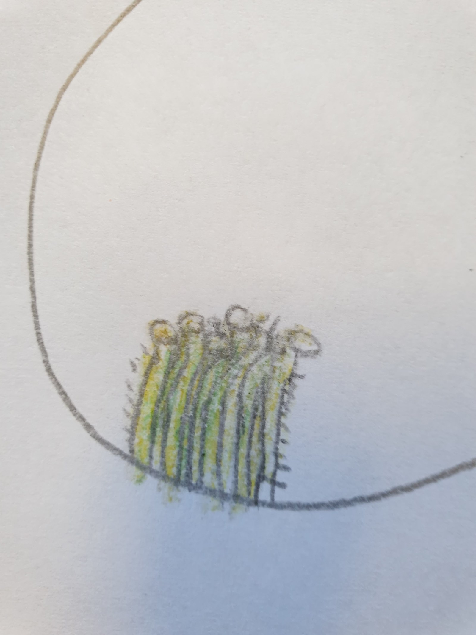 Après-midi, Françoise explique ce qu’est le land art : faire de l’art avec les éléments de la nature. Ici, bien sûr, on va essayer de représenter un terril ! Quelques règles pour collecter sans abîmer, et c’est parti ! En ce mois de mai, il y a vraiment beaucoup d’éléments intéressants : le jaune des boutons d’or et des pissenlits, le vert des cerises pas mûres (on a pu couper la branche parce qu’elle gênait), et de hautes herbes, le bleu des myosotis. Beaucoup de petit bois mort et le schiste rapporté du terril. On dirait que certains préfèrent la collecte que la création patiente de l’œuvre. Il faut travailler en équipe : le collectif est plus difficile que la création personnelle d’une œuvre. Les enfants se disputent un peu, il y a les meneurs, ceux qui ne se sentent pas écoutés, ceux qui rapportent beaucoup de choses mais ne prennent pas le temps de bien les disposer. Zakary ne prend que les chatons, Philippe va au-delà des limites données et revient les jambes remplies de piqûres d’orties. Et pourtant, ils continuent à tous retourner dans cette zone : l’appel du large !