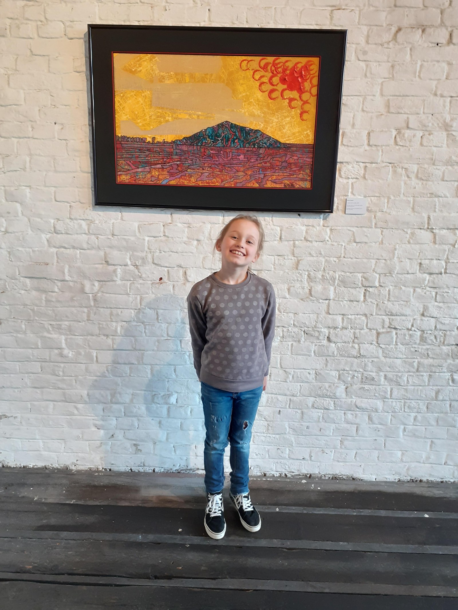 Maëlyne : « J’aime bien celui-ci parce qu’en bas, il a voulu montrer les couleurs qu’il a mises dans son tableau. Il y a des motifs qui font penser à de gros rochers, comme dans l’ancien temps ceux qui dessinaient dans les grottes »