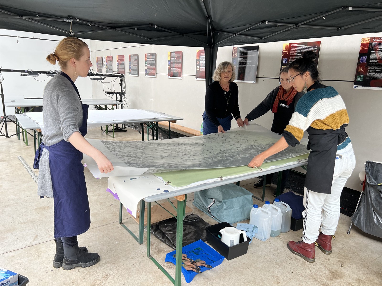 Le dimanche 6 août entre 14h00 et 18h00, Dorothée Wycart et Olivier Guyaux proposent une expérimentation plastique entre symbolisme et alchimie photographique : Triptyque Ishtar, une fresque en cyanotype et carbone de 50 m².